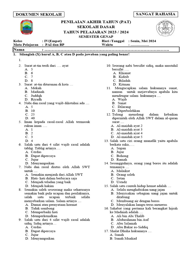 Pendidikan Agama Islam (PAI) merupakan fondasi penting dalam membentuk karakter dan akhlak mulia seorang anak. Di kelas 4 semester 2, siswa akan mempelajari berbagai materi penting yang akan menjadi bekal mereka dalam kehidupan sehari-hari. Memahami jenis soal yang akan diujikan dalam PAI akan membantu siswa mempersiapkan diri dengan lebih baik dan meraih hasil yang optimal. Artikel ini akan mengulas secara komprehensif tentang soal PAI kelas 4 semester 2, meliputi materi yang diujikan, jenis soal, contoh soal, tips belajar, dan bagaimana orang tua dapat berperan aktif dalam membantu anak.