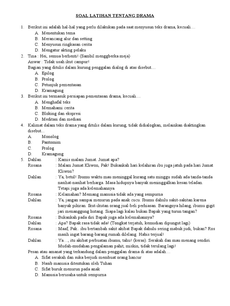 Drama, sebagai salah satu bentuk karya sastra yang paling dinamis, menawarkan pengalaman yang kaya bagi pembacanya maupun penontonnya. Di kelas 12 semester 2, pembelajaran drama biasanya berfokus pada apresiasi yang lebih mendalam, analisis struktur, teknik penulisan, hingga interpretasi makna. Untuk membantu siswa menguasai materi ini, memahami contoh soal dan pembahasannya menjadi kunci. Artikel ini akan menyajikan beberapa contoh soal esai dan pilihan ganda yang relevan dengan materi drama kelas 12 semester 2, lengkap dengan pembahasan mendalam yang diharapkan dapat memperluas pemahaman.