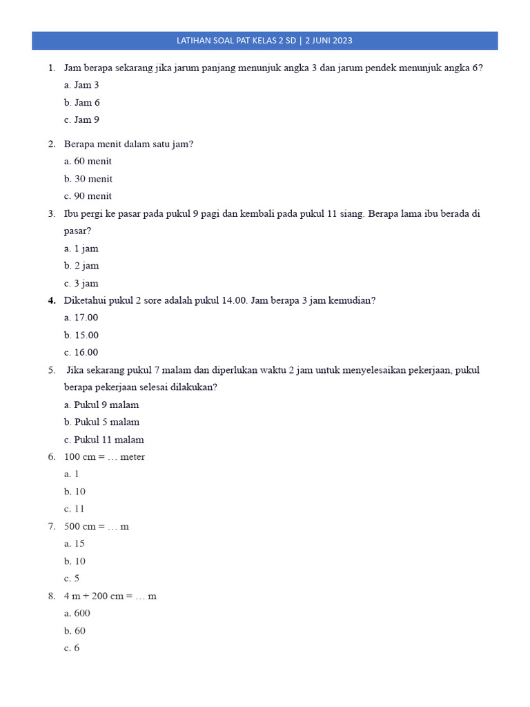 Penilaian Akhir Tahun (PAT) kelas 2 SD adalah langkah penting dalam perjalanan akademis anak. Persiapan yang matang melalui latihan soal PAT dapat memberikan keuntungan signifikan. Dengan memahami pentingnya latihan, mengetahui cara mengakses soal-soal yang relevan, dan mengoptimalkan proses belajarnya, baik guru maupun orang tua dapat membantu siswa kelas 2 SD meraih hasil terbaik.