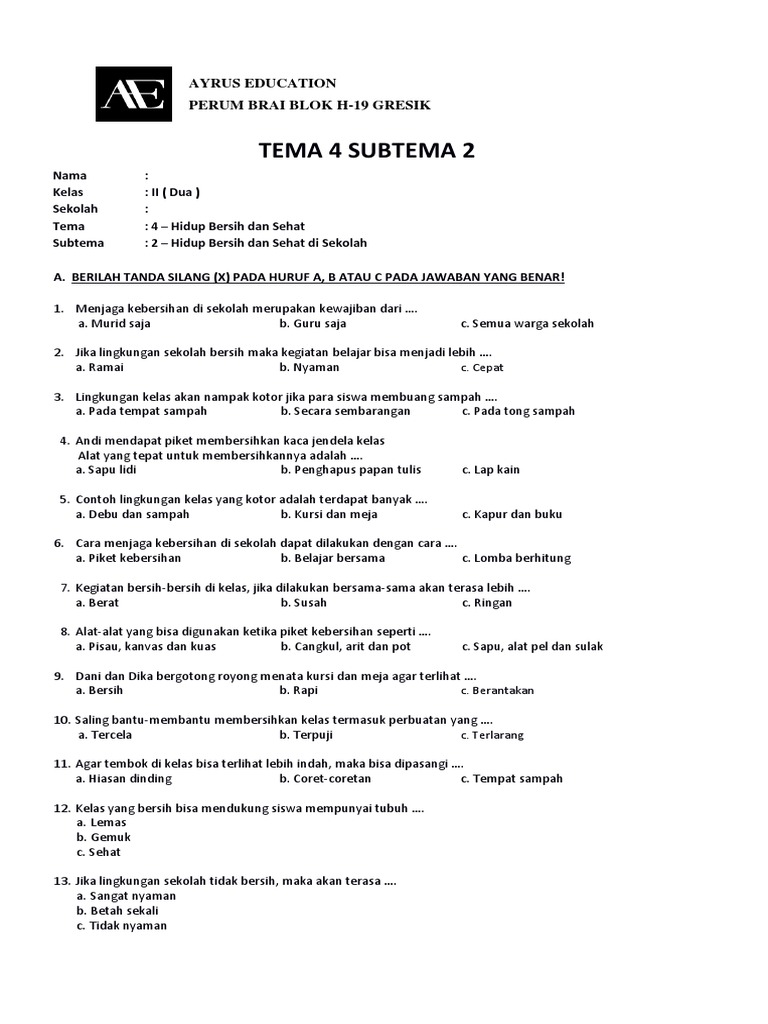 Tema 4 kelas 2 SD, "Hidup Bersih dan Sehat," merupakan fondasi penting dalam menanamkan kesadaran akan pentingnya kebersihan, kesehatan, dan lingkungan yang lestari pada anak-anak. Melalui tema ini, siswa diajak untuk memahami bagaimana menjaga kebersihan diri sendiri, lingkungan rumah, sekolah, serta dampaknya terhadap kesehatan. Soal-soal dalam tema ini dirancang untuk menguji pemahaman konsep, kemampuan berpikir kritis, dan penerapan nilai-nilai hidup bersih dan sehat dalam kehidupan sehari-hari.